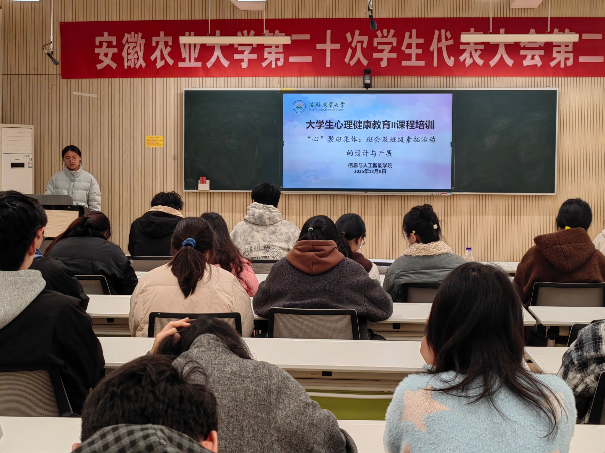 聚焦课程建设,赋能活动策划。第二场培训聚焦“‘心’聚班集体:班会及班级素拓活动的设计与开展”,学院学生分会公益志愿中心负责同学围绕心理健康课程建设与班级活动策划展开指导。培训首先介绍了《大学生心理健康教育Ⅰ》《大学生心理健康教育Ⅱ》的课程体系,详细解读了线上课程的学习考核要求与线下实践的学时认定标准。培训强调活动需紧扣“心理健康”核心主题,结合学生成长需求设计兼具趣味性与实效性的内容,着力实现拉近距离、增强信任、释放压力的活动目标,指导心理委员如何统筹协调资源,让班级心理活动既能满足学时认定要求,又能真正走进学生内心,切实提升同学们的心理调适能力与集体归属感。