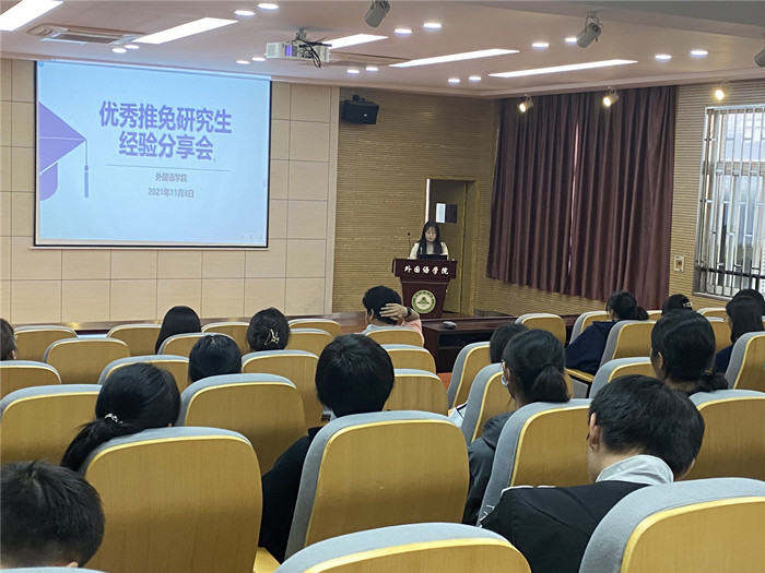 为帮助学生端正学习态度,营造良好的学习氛围,引导学生树立远大目标,做好职业规划,11月3日下午,外国语学院在外语楼502多功能报告厅举办了优秀推免研究生经验分享会,学院副院长许宗瑞参加并主持分享会。