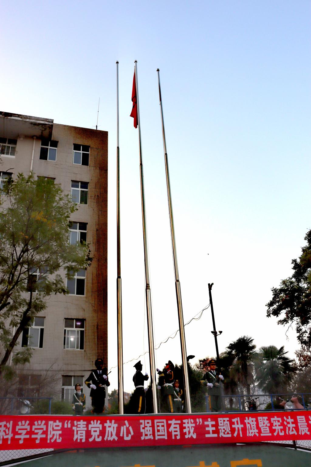 上午7时,国旗护卫队昂首挺胸护卫国旗,迎着朝阳,迈着整齐的步伐行进至升旗台。伴随着雄壮的《义勇军进行曲》,鲜艳的五星红旗冉冉升起,全场肃立行注目礼,齐声高唱中华人民共和国国歌,嘹亮的歌声响彻校园。