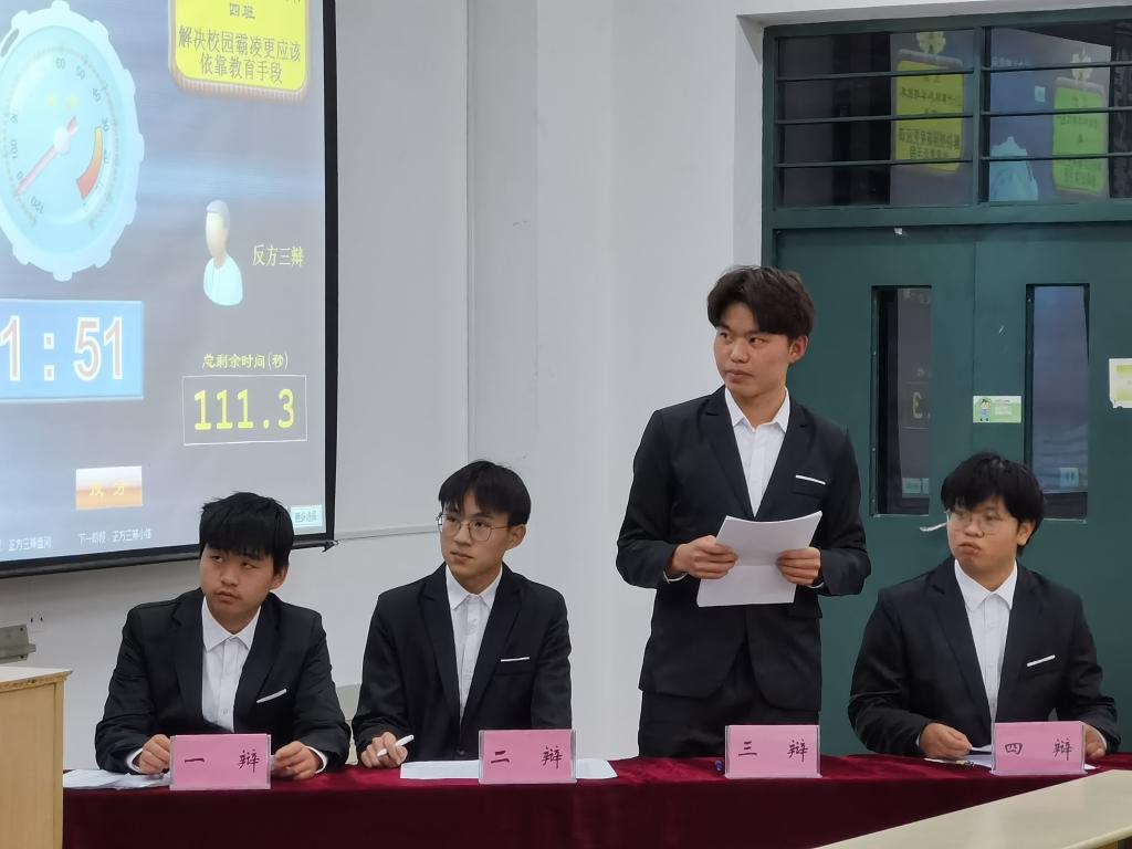决赛首先进行季军争夺战,围绕辩题“学生应该更注重知识培养还是人格培养”大展开,场上同学们结合当代教育以及大学生自我修养论述出独特的观点。而后,冠军争夺战如火如荼地进行。双方结合热点时事对辩题“解决校园霸凌依靠法律手段还是教育手段”从教育、法律、心理等层面进行阐释,通过辩论,同学们对健康校园生活与正确人际交往有了更深理解。