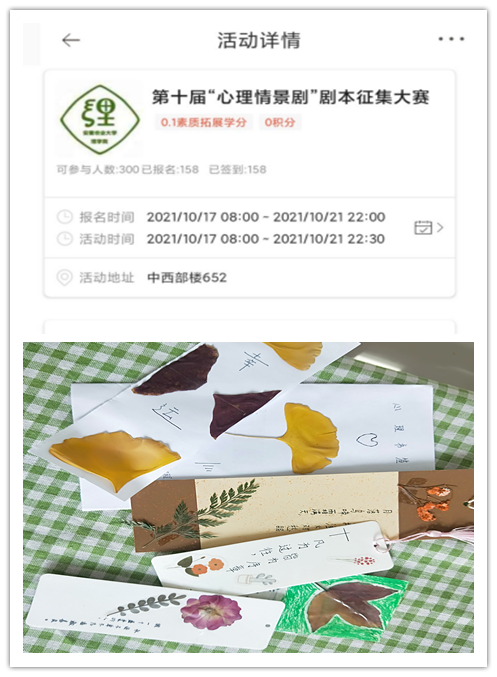 “秋冬的心事”心理书签制作大赛。11月中下旬,学院开展以“秋冬的心事”为主题的心理书签创作大赛,共收到70余件作品,参赛学生利用校园里的枯枝、落叶等大自然的材料,制作形成反映“秋冬的心事”的创意贴画,并附上作品介绍和所蕴涵的心理意义。