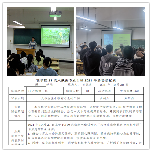 今年十月,理学院各班级围绕“生命教育与危机关注”开展一次心理健康教育主题班会,为了保证活动质量,提高活动效力,学院统一制作班会内容和视频。活动结束后,各班级积极提交了班会总结和照片。通过此次活动的开展,引导学生认识生命、珍爱生命;了解心理危机相关知识,知晓心理危机的发生发展机制,掌握应对危机的技巧。