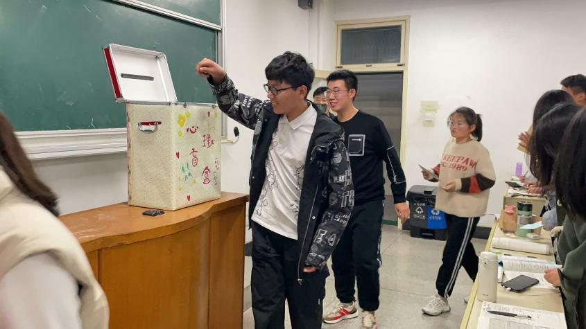 学院心理工作站成员利用晚自习和课间时间,组织同学们匿名将自己的心理问题写在明信片上,问题可以是学习上的,也可以的感情、生活、人际交往上的,然后放入“心理盲盒”内。