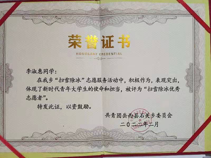 寒假期间,经济管理学院多名学生积极响应学院号召,主动参加各类社会实践活动中。学院束恒烨、柳俊杰、赵川、王志豪、李张珂、张阳阳、方天羽等多名同学积极投身到家乡疫情防控志愿服务中,以高度的责任心和使命感带头落实安全防护措施,积极参与社区(村)疫情检测布点、宣传等工作,在战“疫”斗争中展现了经管学子的时代担当与青春风采。学院2020级经济学专业(3)班郭冰同学通过亳州晚报社实习记者的身份调研亳州市乡村振兴工作开展情况,并利用专业所学积极为家乡“乡村振兴”建言献策。2020级金融学(5)班学生李淑惠在岳西县石关乡兼职团委副书记,通过志愿服务关注留守儿童,关照孤寡老人,做好文旅设施环境管护等,并被岳西县石关乡团委授予“扫雪除冰优秀志愿者”荣誉。(通讯员:胡正飞)