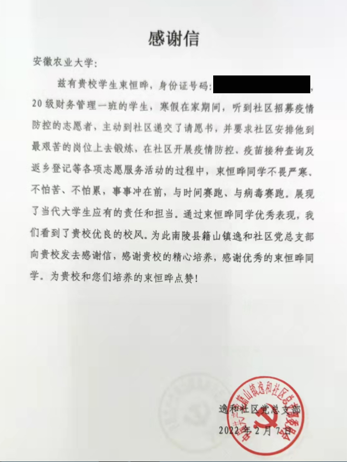 本网讯 新学期伊始,学校就收到了南陵县籍山镇逸和社区党总支部的感谢信。信中写到:“束恒烨同学不畏严寒、不怕苦、不怕累,事事冲在前,与时间赛跑、与病毒赛跑,展现了当代大学生应有的责任和担当……。”感谢信的背后,不仅是对束恒烨同学勇于担当、暖心服务的勉励,更是对学校优良校风的高度肯定。