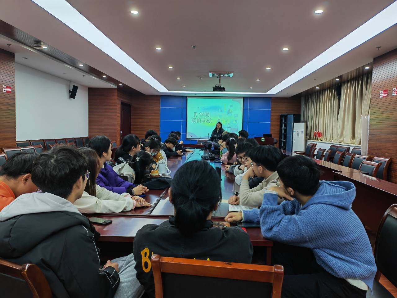 班会上,辅导员以“新学期,新气象,新跨越,新成绩”为题,回顾了班级上学期的工作,总结了经验指出了不足,提出了下一步班级建设的班级目标和愿景。其次,就同学们的学习成绩、学业规划进行了梳理和探讨。要求同学们要尽快调整好心态,将自己从假期的作息中拉出来,合理安排新学期的学习计划,迎接新学期课程的到来。