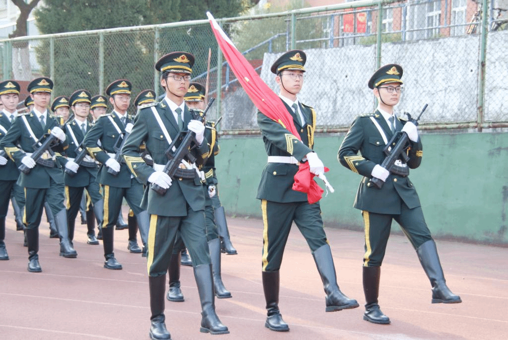 在学校国旗护卫队护卫下,伴随着庄严的《义勇军进行曲》,师生齐声高唱国歌,深情注视着鲜艳的五星红旗在晨曦中冉冉升起、迎风飘扬。