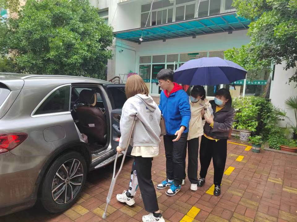 电气系得知有两名学生因前期体育训练骨折行走不方便,一大早便组织系部老师驾车去大学生公寓,将学生安全接到校内体育馆顺利做上了核酸,师生情谊在阴冷的雨天显得格外有 “温度”。