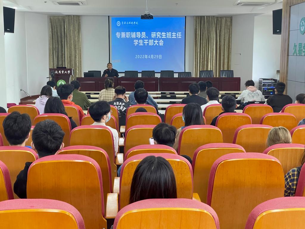 本网讯 4月29日中午,资源与环境学院召开全体学生干部网络视频大会。学院各本研班级主要学生干部现场参会,全体班委会成员、团支部成员,全体寝室长线上参会,专兼职辅导员、研究生班主任线上列席。大会由学院党委副书记、纪委书记、副院长姚洪章主持。