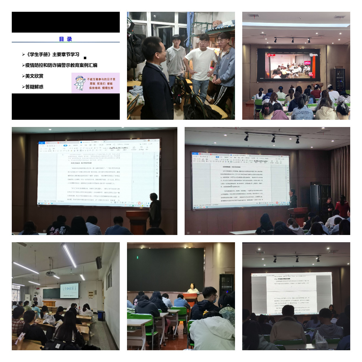 本次主题班会主要围绕“1+2+N”模式,即“1”是指重点学习最新版《学生手册》中本科学生素质综合测评实施办法、奖学金评定办法、优秀本科学生评选办法、先进班集体和十佳班集体评选办法以及学生安全教育和违纪处分办法等;“2” 是指《植物保护学院疫情防控和防诈骗警示教育案例汇编》和征兵工作;“N”是指习近平总书记五四青年节前夕在考察中国人民大学时重要讲话精神,疫情下学生焦虑等不健康心理的劝慰与开导,以及学院“课后十分钟”活动的问题解答;会议最后还强调了消防安全(违规电器、使用明火、吸烟、私拉乱接电线等)、人身财物安全、禁止宿舍饲养宠物等内容。