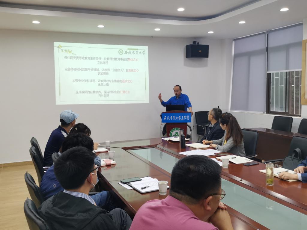 学院副院长许良元围绕严守师德规范、把牢师德底线,从授课纪律、学术道德、行为规范等方面进行话题导入,开展交流分享。在研讨中,土木水利系主任杨智良老师谈到“专业课教师在教育教学方面,既要重视专业素质教育和科研能力培养,同时也要做到对学生有恒心、有爱心、有耐心,及时回应学生诉求,努力在价值引领上当好他们的引路人”;电气工程系主任周平老师围绕如何推动教师转变教育教学理念,提出了“要促进教师从职业性向理想性转变、从传授知识向全方位育人转变,同时要不断加强对青年教师的理想信念教育,切实强化教师队伍的责任担当”;青年教师刘策老师结合工作实际,对当代教师应如何做好大学生的知识传授、思想引导、人文关怀等工作进行交流分享。