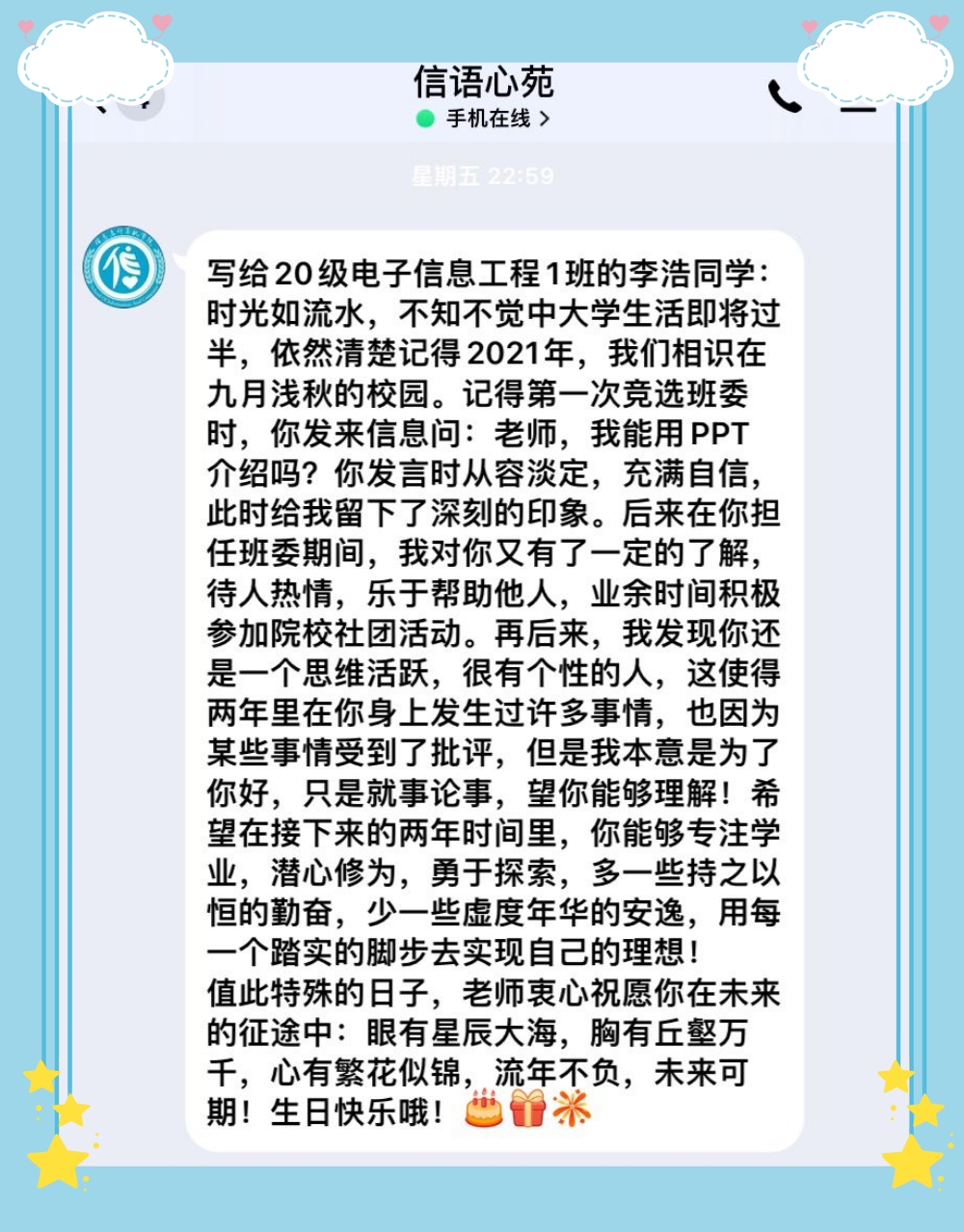 一岁一礼,一寸欢喜。心理站专门给5.20、5.21生日的同学准备了生日版晚安祝福。“处处美景,岁岁良辰”,这不仅是心理站送出去的生日祝福,也是心理站对于广大学子的美好祝愿。期间,20级电子专业李浩同学还特别收到一条来自辅导员丁春荣老师的晚安祝福,心理站也成了师生情感沟通交流的链接。