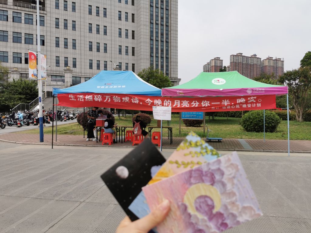 活动前期,工作人员温馨选制符合主题的精美明信片,精心制作晚安祝福投放信箱。活动从在展台处挂上“生活细碎,万物成诗,今晚的月亮分你一半,晚安”的横幅开始,学院心理站共发送近500条晚安祝福。生活虽细碎,万物皆可诗。密密麻麻的课业安排,零零碎碎的生活日常,我们只要用心生活,也可以将零碎重组成生活的韵脚,这是心理战运营的诗意理念。