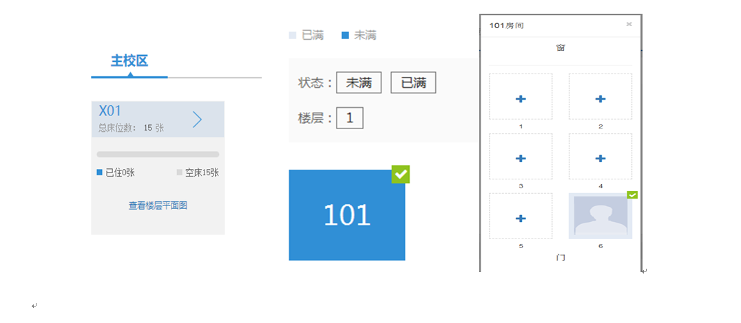 4、点击“网选宿舍”(实际界面与图例可能有少量不同)。点击“X01”区域向右箭头,再点击“101”区域,选择床号。实际界面有可供选择的宿舍号,选好宿舍号后,再选床号。注意:选好后不可更改。合肥市区学生如办理走读,无需选择宿舍,直接进入下一步。(备注:X01代表学生社区南区1栋;若是G01代表学生社区北区1栋;101是房间号)