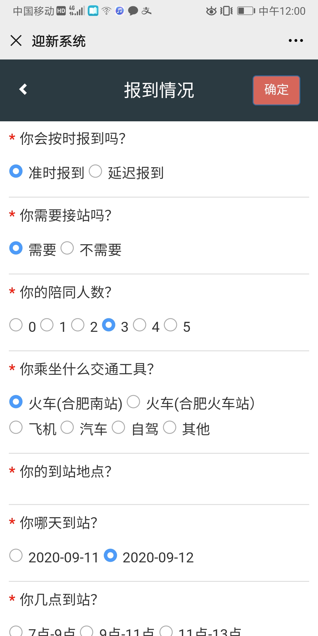 7、点击“报到情况”。采集报到信息,请准确填写是否要接站、到站地点、以便学校统筹安排迎新车辆。