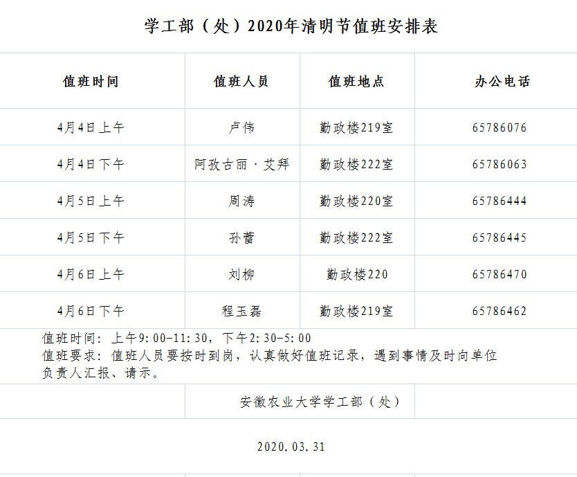 学生处2020年清明节值班安排表