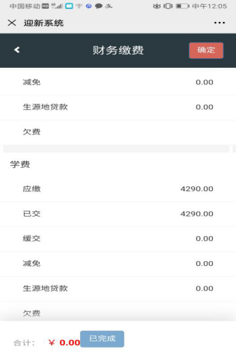 6、点击“财务缴费”。可直接查看学费缴纳的清单。缴费信息是默认大家采购生活用品的,选择不购买的同学,缴费信息里也含生活用品费用,这个没有关系,到校后学校根据领取记录给予退还。(此界面为测试界面,数字也为随机测试数据,请以实际界面收费标准为准)