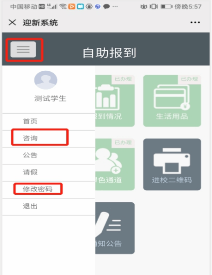 1、点击“新生报到”,初次登陆弹出绑定页面:用户名是身份证号,初始密码是身份证号的后六位。绑定后下次登陆无需重复输入用户名和密码。
