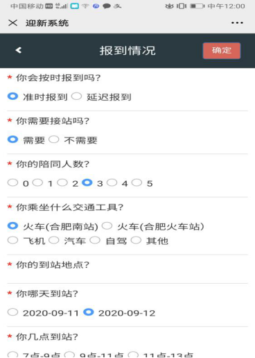 7、点击“报到情况”。采集报到信息,请准确填写是否要接站、到站地点、陪同人数等信息,以便学校统筹安排迎新车辆。