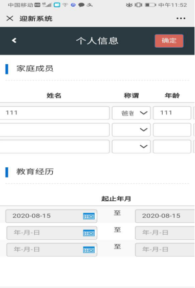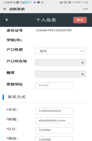 3、点击“个人信息”。补充完整所缺空白项,“确定”,并点击“下一步”。个人信息包括如下:健康状况:(不能录入,点击下拉框选择)健康或良好等;血型(选填);户口性质:选择城镇或农村;生源地、出生地:(不能录入,点击下拉框选择) ;何时入党(团):(不能录入,点击年、月、日选择),入党(团)地点:填写某省某市某学校或具体单位;入学时间:(不能录入,点击年、月、日,选择2020年9月11日或12日或18日);学前单位:高中或专科学校名称,信息已经导入,如有错误,可更改;家庭住址:填写某省某市或某县某某小区或某某村居;考生类别:应届或往届;受过何种奖励或处分:填写某省某市某学校三好学生等或无;乘车区间:学校到家乡地点或父母务工地点;家庭成员和主要社会关系成员信息(包括姓名、性别、年龄、与本人关系、政治面貌、现工作单位及职务、联系电话),如果是孤儿的,家庭主要成员写监护人信息(手机端页面操作时注意不要遗漏后面的内容,可以触屏左右移动填写框);教育经历:起止年月(不能录入,点击年、月、日选择)、所在学校或单位名称、担任职务;(手机端页面操作时注意不要遗漏后面的内容,可以触屏左右移动填写框)。从小学开始写起即可。