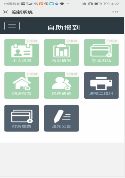各个环节完成是没有顺序的。进入自助报到系统后,先点击网选宿舍,宿舍选择好了后再完善其他环节。系统中同学们可以看到的宿舍都是可以选择的。宿舍选择后不可以更改。办理某个环节后点击左上角箭头返回主页。
