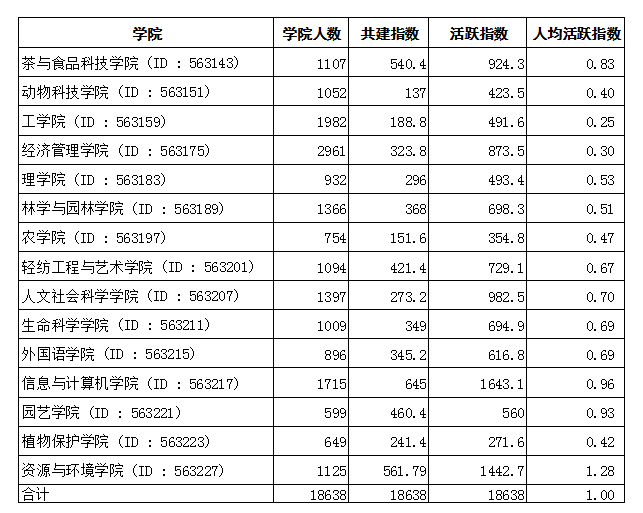 2.学院(机构群)活跃指数根据以下指标计算:①学院主页访问量;②在校用户易瞄瞄、快搭、题库、资料库、微社区、轻投票、轻博客、易运动、轻问卷活跃值。