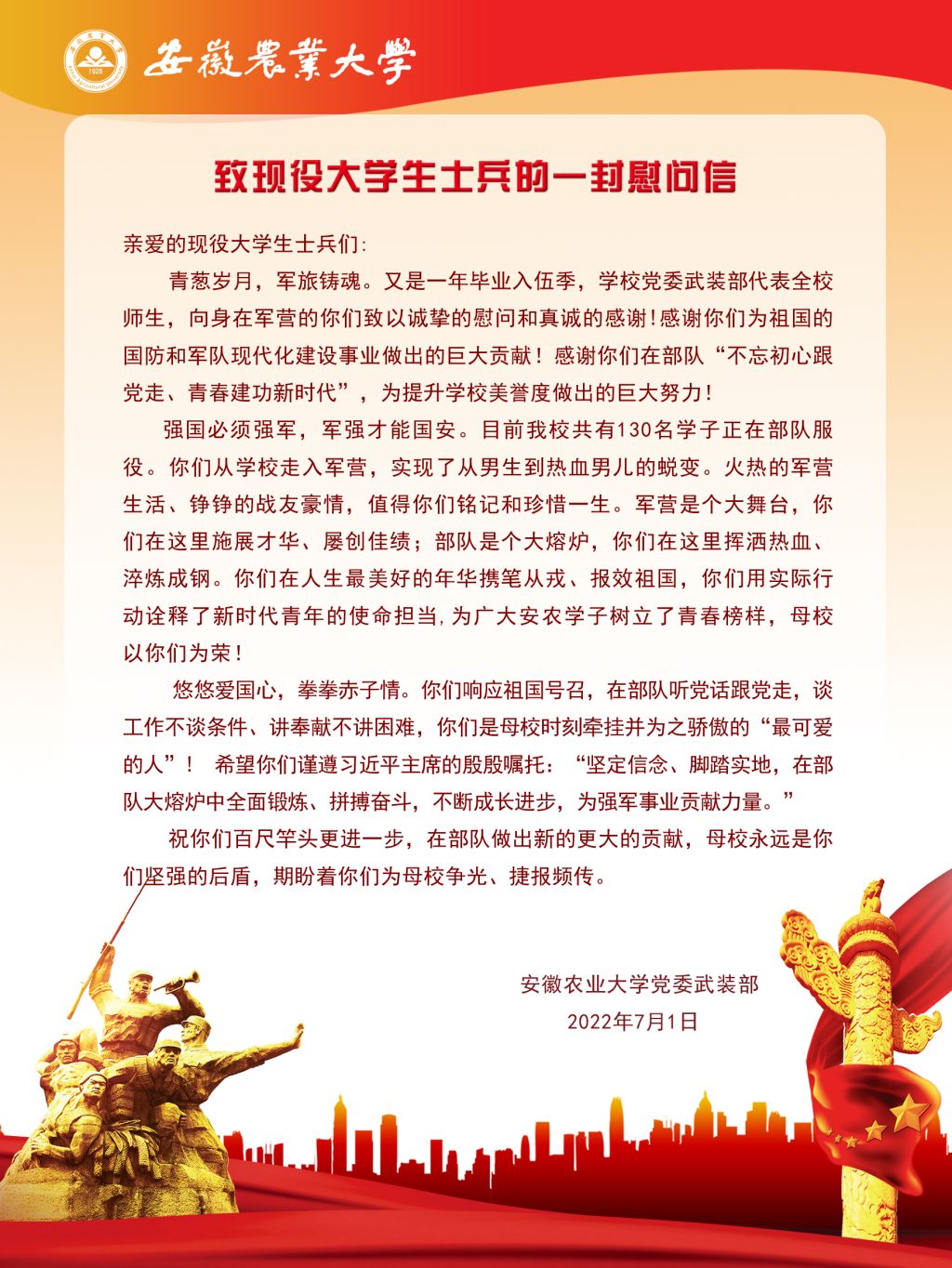 致现役大学生士兵的一封慰问信