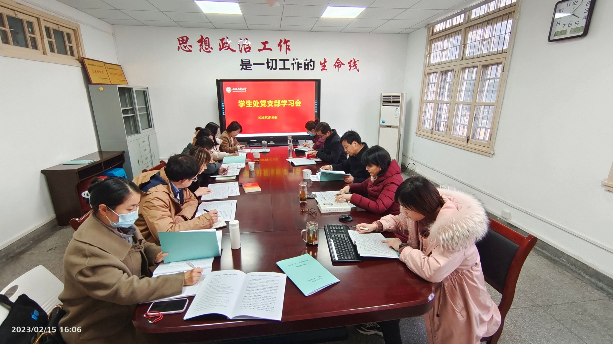 本网讯 2月15日下午,学生处党支部组织开展“优环境、严纪律、强作风”主题党日活动,活动包括清理责任区、主题学习和支部书记讲党课,校党委副书记裴树东以普通党员身份参加会议,会议由党支部书记姚莉主持。