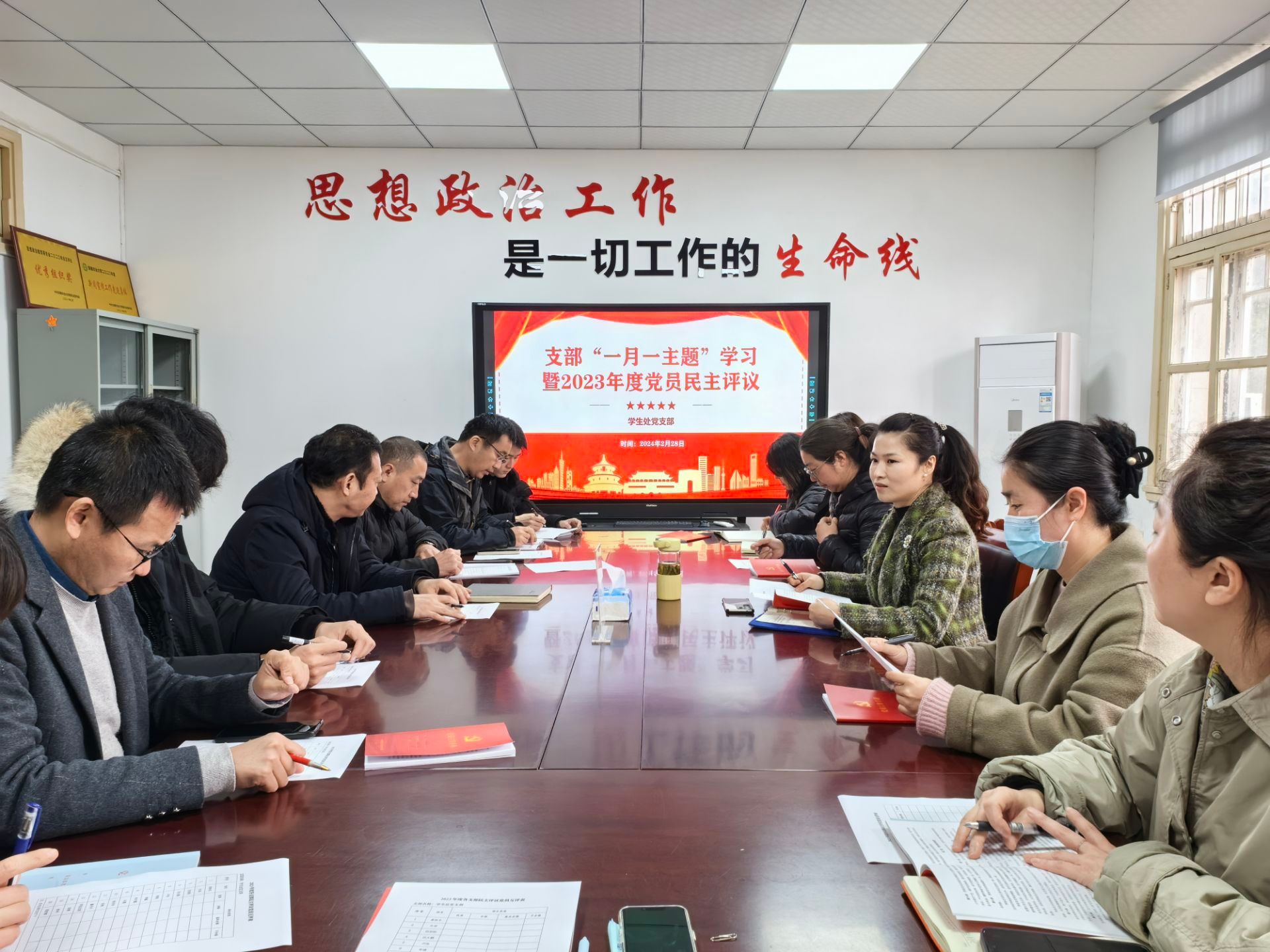 本网讯 2月28日下午,学生处党支部在勤政楼224会议室召开“一月一主题”理论学习暨民主评议党员,党支部全体党员参会,党支部书记任琪主持会议。