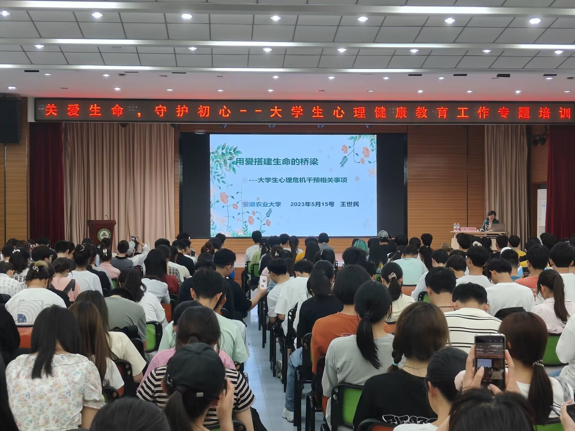 5月15日晚上,学校邀请安徽警官职业学院王世民副教授在欣苑四楼小礼堂开展“用爱搭建生命的桥梁——大学生生命健康教育”专题讲座,全校近500名心理委员参加培训。王世民结合丰富的学生案例,从心理委员的工作职责、大学生心理健康的标准、心理问题等级划分、大学生常见心理问题、如何发现心理危机学生、出现危机后的处置等方面做了详细的讲解。整个讲座过程,同学们认真投入,为进一步发挥学生心理队伍在心理健康教育工作中的作用,实现“助人自助互助”成长模式,起到了很好的助推作用。