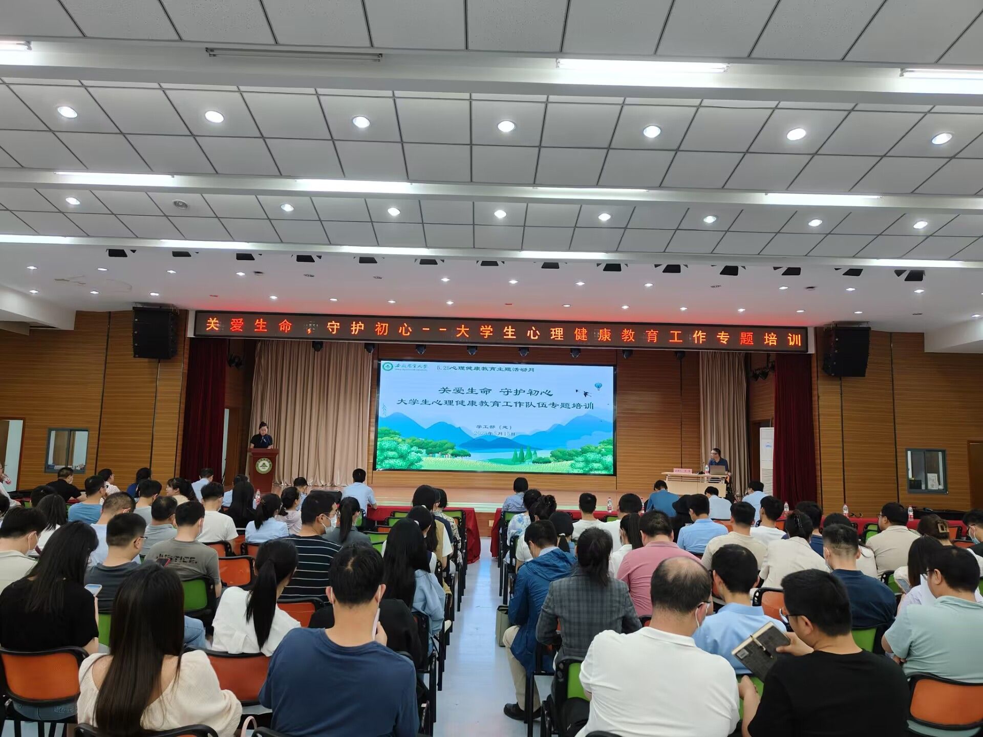 5月15日下午,学校邀请安徽工业大学学工部副部长王军教授在欣苑四楼小礼堂开展大学生心理危机的识别与干预专题讲座,学工部(处)负责人、各学院党委副书记、全体专兼职辅导员、研工部近三年新遴选的研究生导师、新入职教师(2023年计划带研究生)、研究生教育管理工作者等近300人参加培训。王军结合长期高校工作实践,向大家生动详细讲解了心理问题产生的原因、常见精神障碍识别和常用的心理危机干预技术等内容。讲座既有理论高度,又有很强的实操性,获得老师们的一致好评,对学校下一步心理工作的开展有很强的指导作用。