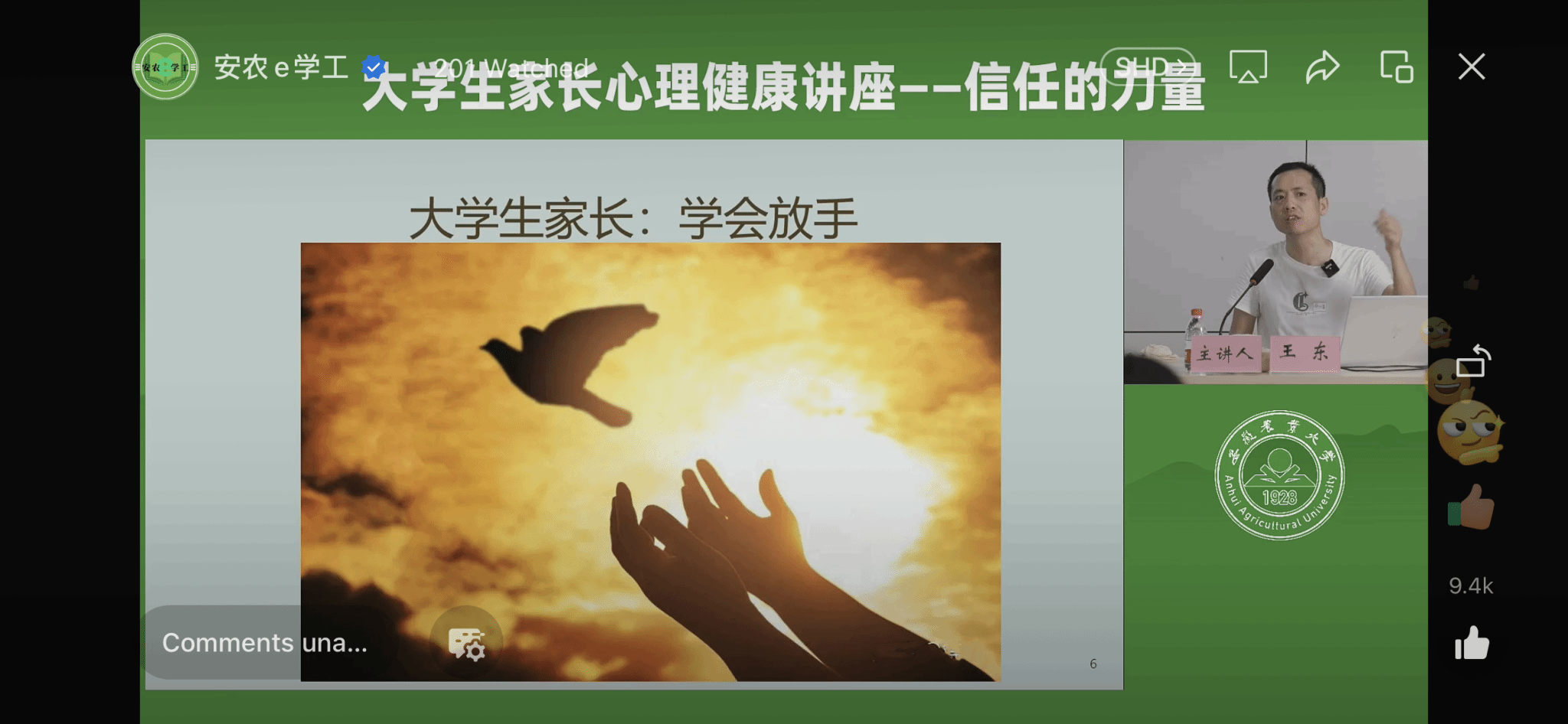 本网讯 为持续推动家校共育,充分发挥家庭育人功能,提升学生心理健康素养,8月31日新生报到当天,学工部(处)组织开展“家校共育 呵护‘种芯’”新生家长心理健康知识讲座。此次专题讲座由人文学院心理学教师王东主讲,采用线下和线上同步直播的方式进行,近千名家长参与,微信视频号获得1.4万次喝彩。