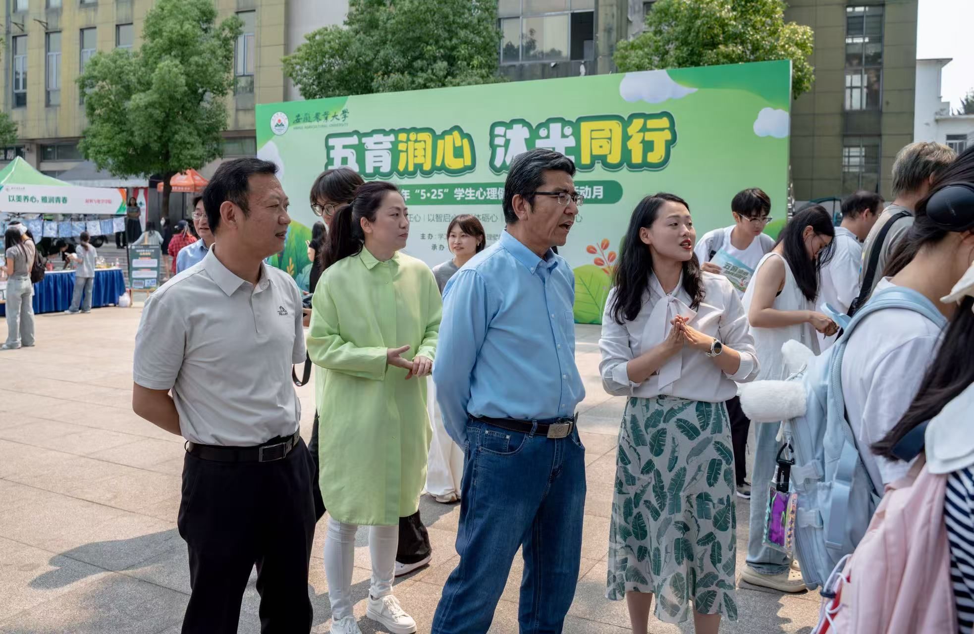 本网讯 5月26日上午,我校在欣苑西广场举办“五育润心 沐光同行”——“5·25”心理体验嘉年华。活动现场气氛热烈趣味游戏、互动体验等多元项目亮点纷呈为全校师生打造一场充满乐趣与治愈的心灵之旅。校党委副书记董雨与学生处、各学院学生工作负责人一同深入活动现场观摩指导各环节的组织与开展。