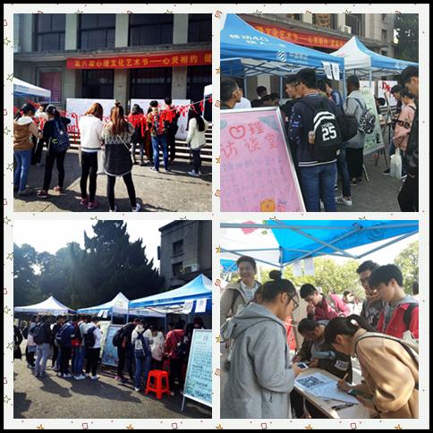 为进一步促进心理健康教育工作的开展,为大学生营造积极向上的心理健康教育氛围,11月6日和7日,由学工部(处)学生心理健康教育与咨询中心主办、大学生心理委员联合会和大学生阳光心理阳光协会承办的第六届心理文化艺术节系列活动在大礼堂前举办。