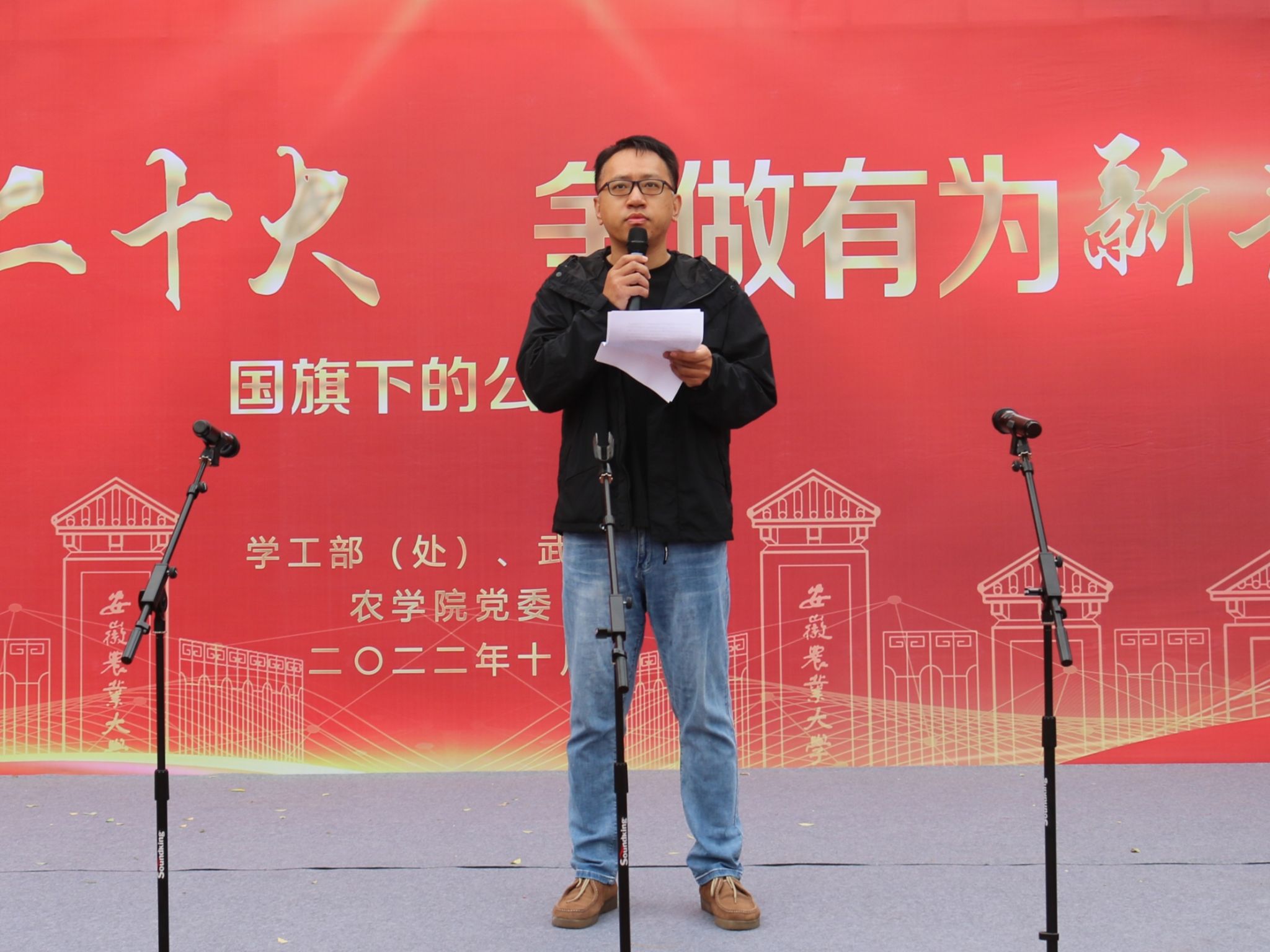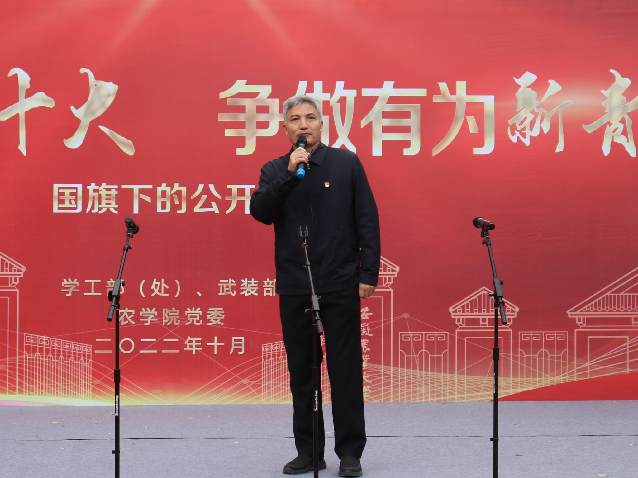 (本网讯)10月17日清晨7点整,农学院在校第一运动场举行“献礼二十大 奋进新征程”升旗仪式暨“国旗下的公开课”主题教育活动。学工部(处)处长姚莉、副处长刘柳,学院党委书记洪志生、副院长宋贺,全体专职辅导员和农学院80名2022级本科学生代表参加此次活动,活动由专职辅导员彭琼琼主持。