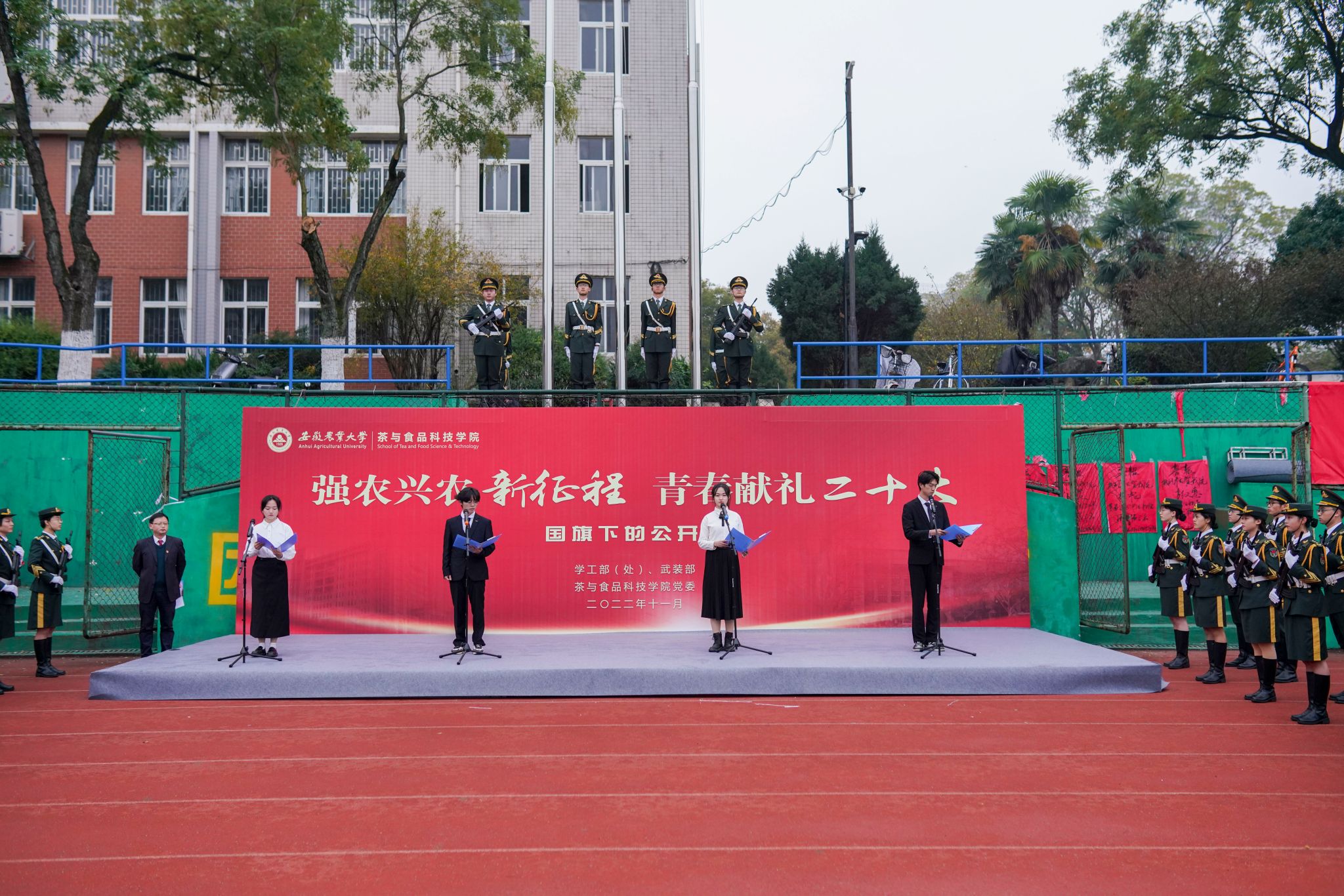 礼毕,由殷朝阳等四名学院主持队同学带来《学习二十大精神 努力奋进新征程》主题朗诵。四位同学用激情澎湃的声音对党许下青春的誓言:学习党的二十大精神,树立远大理想,勇担强农兴农重任,做不负时代、不负人民的安农青年。