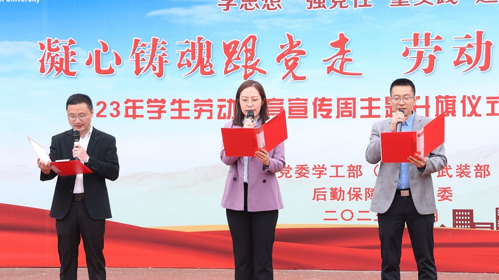 本网讯 为深入开展学习贯彻习近平新时代中国特色社会主义思想主题教育,增强师生爱国主义情怀、弘扬新时代劳动精神。5月8日早上,学校在第一运动场举行“凝心铸魂跟党走,劳动铸就新征程”主题升旗暨国旗下的公开课活动。党委学工部(处)、武装部、后勤保障处、团委等单位负责人、相关老师及学工部(处)所属学生组织全体学生干部参加了仪式。仪式由党委学工部(处)、武装部副处长周涛负责人主持。