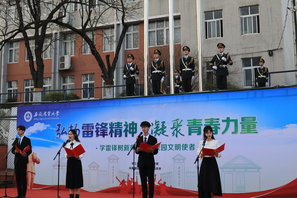 清晨七点,身着绿色军装的国护队披着朝霞、踏着清露,站在红色的塑胶跑道上,他们脚踩整齐的步伐,英姿飒爽;他们高喊嘹亮的口号,铿锵有力;国歌响起,红旗飘扬,队员们挺拔身姿肃立在升旗台前、红旗之下。一抹国旗红,一袭军装绿,握五尺钢枪,着一身戎装。每每目睹那抹炽烈的红在熹微晨光中冉冉升起,满腔热血便随之沸腾。随后由志愿者代表朗诵诗歌,飞扬音乐社献唱歌曲,并在学生代表领誓下集体宣誓,以歌颂弘扬雷锋精神,鼓励青年大学生积极奉献。最后,校团委书记林煦东发表了讲话,充分肯定了广大青年志愿者响应社会号召投身志愿活动的良好氛围,提出青年学子要勇于“立大志、明大德、担大任”,将雷锋精神传承在中华大地。雷锋日