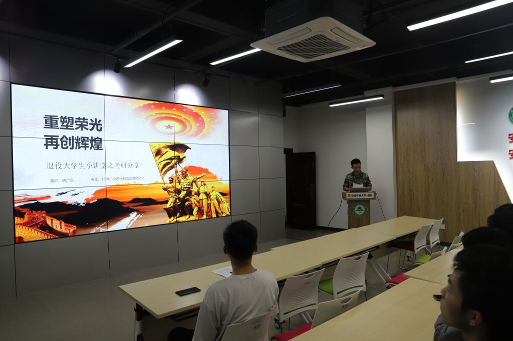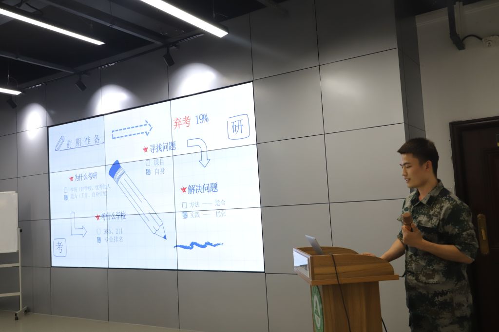 活动中,两位退役学长先后分享自己备战考研期间的时间规划、思想压力调节方式、各科目复习攻略等内容,推荐了相关参考资料、网络课程以及实用的记忆方法和时间管理方法。他们紧扣当下大学生关注的焦点进行分析,也细述了退役复学后备战考研的心路历程,言语幽默。小讲堂学术氛围浓厚,受到了学弟学妹们的热烈欢迎。