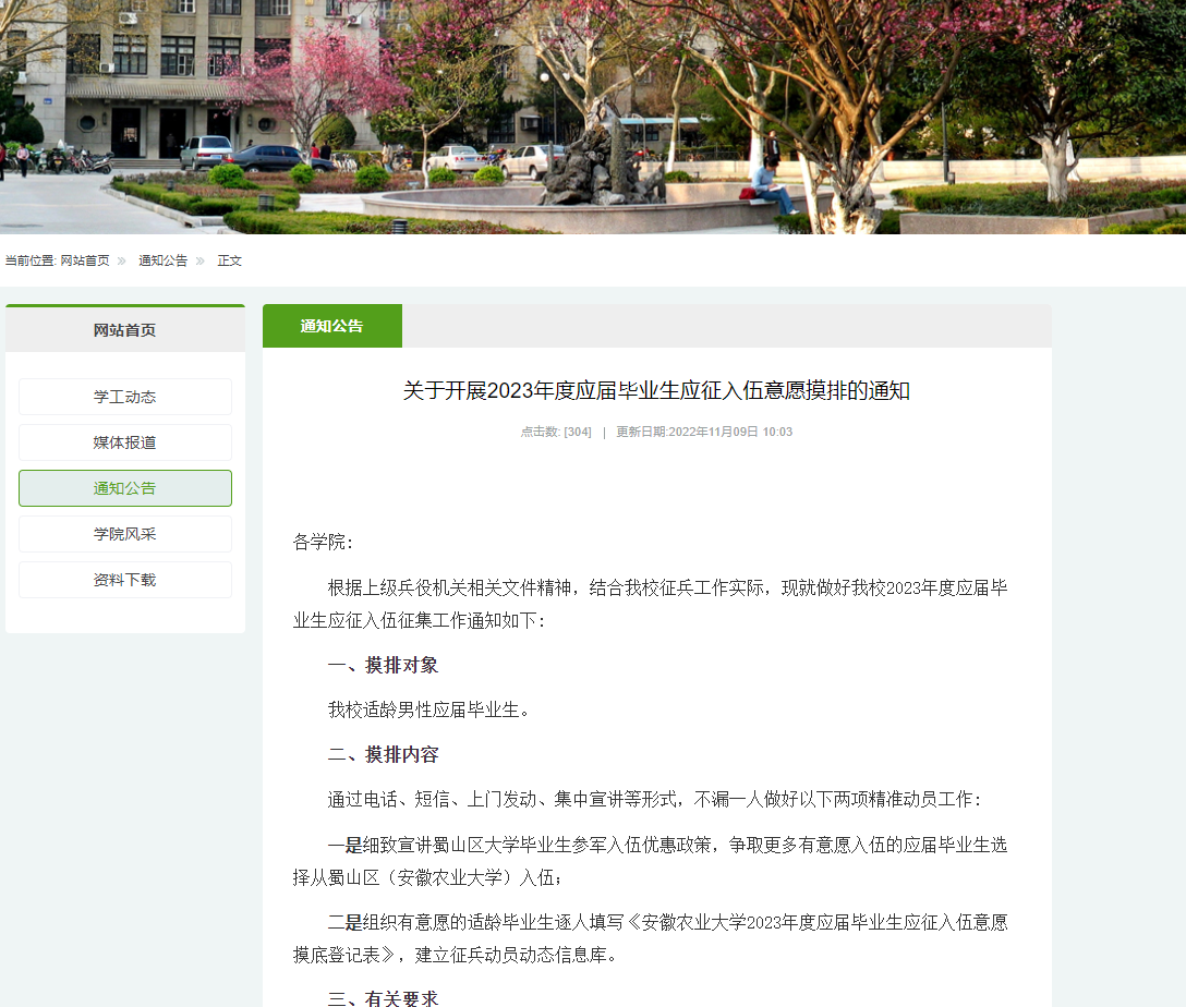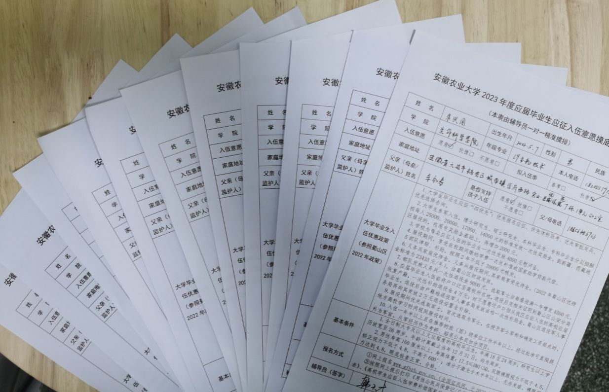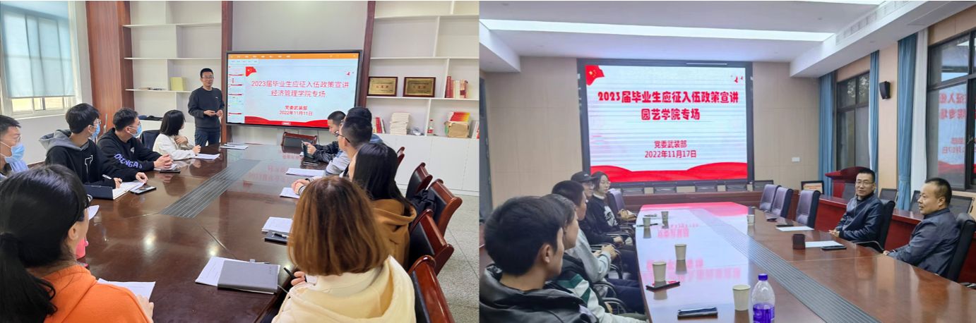 开展业务培训。11月初,学校召开2023年春季征兵工作部署暨业务培训会,对2022年征兵工作进行了系统总结,并结合《安徽农业大学大学生应征入伍工作流程操作指南(2023年版)》,对各学院征兵工作专干进行业务培训。