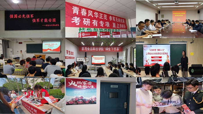 4-5月,学校开展了“携笔从戎精彩人生 强军报国无上光荣”为主题的国防教育和征兵宣传月活动。活动开展以来,武装部邀请武警安徽总队在役大学生士兵来校开展国防教育和征兵宣传动员报告,搭设宣传桁架、悬挂宣传横幅、编写大学生入伍政策“明白纸”,在毕业生就业“双选会”期间摆放征兵宣传展台,选聘征兵宣传大使,分片区下沉到学院、毕业班辅导员、毕业生宿舍,开展“进院入班、登楼入寝”精准宣传30余场,发放征兵宣传单页2000余份。指导各学院结合实际,开展了系列特色活动,如 “红色系列征集”、“精准动员动态跟踪”、“点-线-面三部曲”、“优服务、瞄靶向”、“师生下午茶”、“征兵工作提前‘亮’”等,校园征兵宣传氛围浓厚。