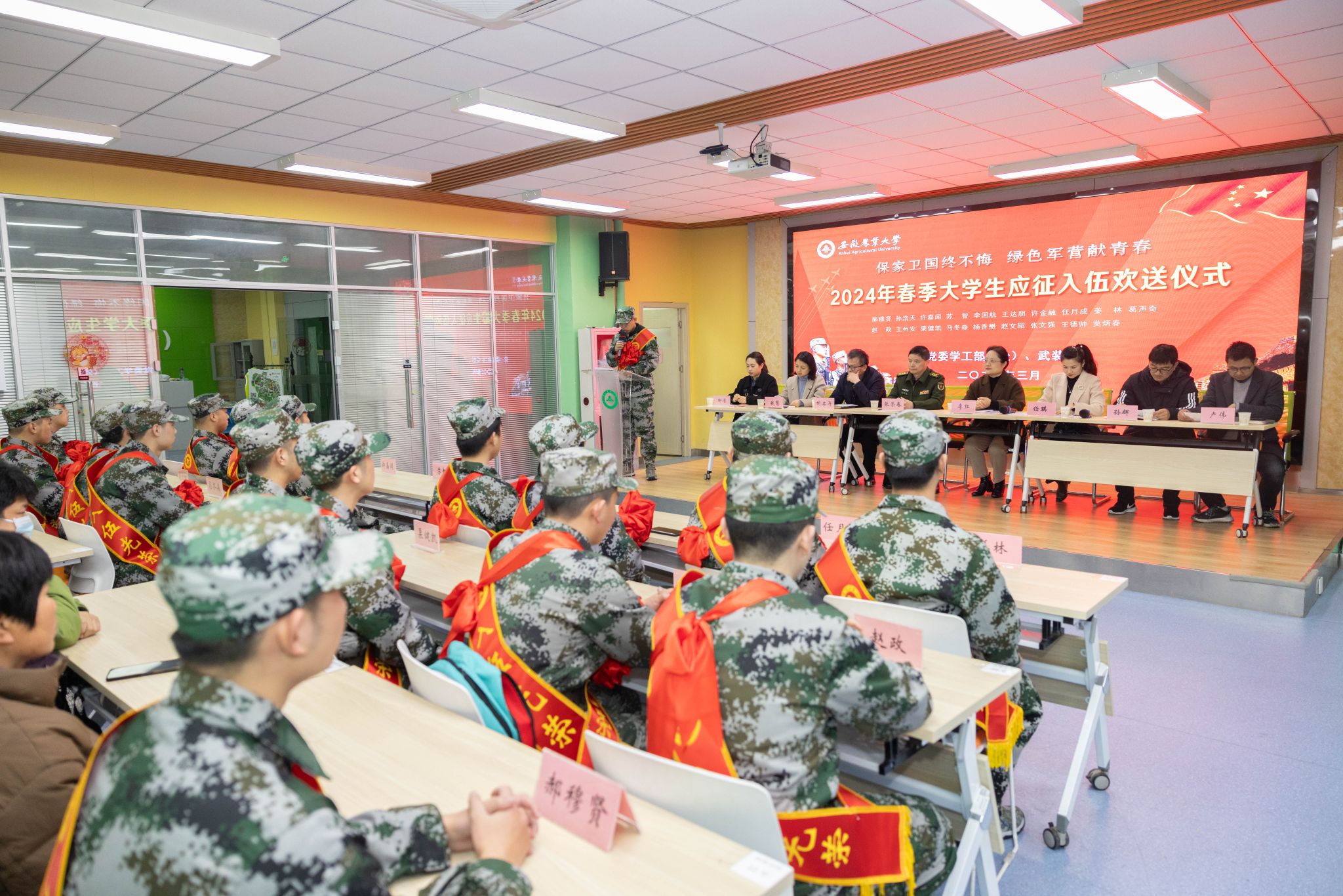 本网讯 3月4日下午,我校在大学生创客空间举行2024年春季大学生入伍欢送仪式。校党委常委、副校长李红,蜀山区人武部上校部长张荣春,宣传部、教务处、学工部(处)、武装部、校团委、继续教育学院等单位负责人、各学院副书记、入伍学生和辅导员及家长代表近百人参加欢送会。