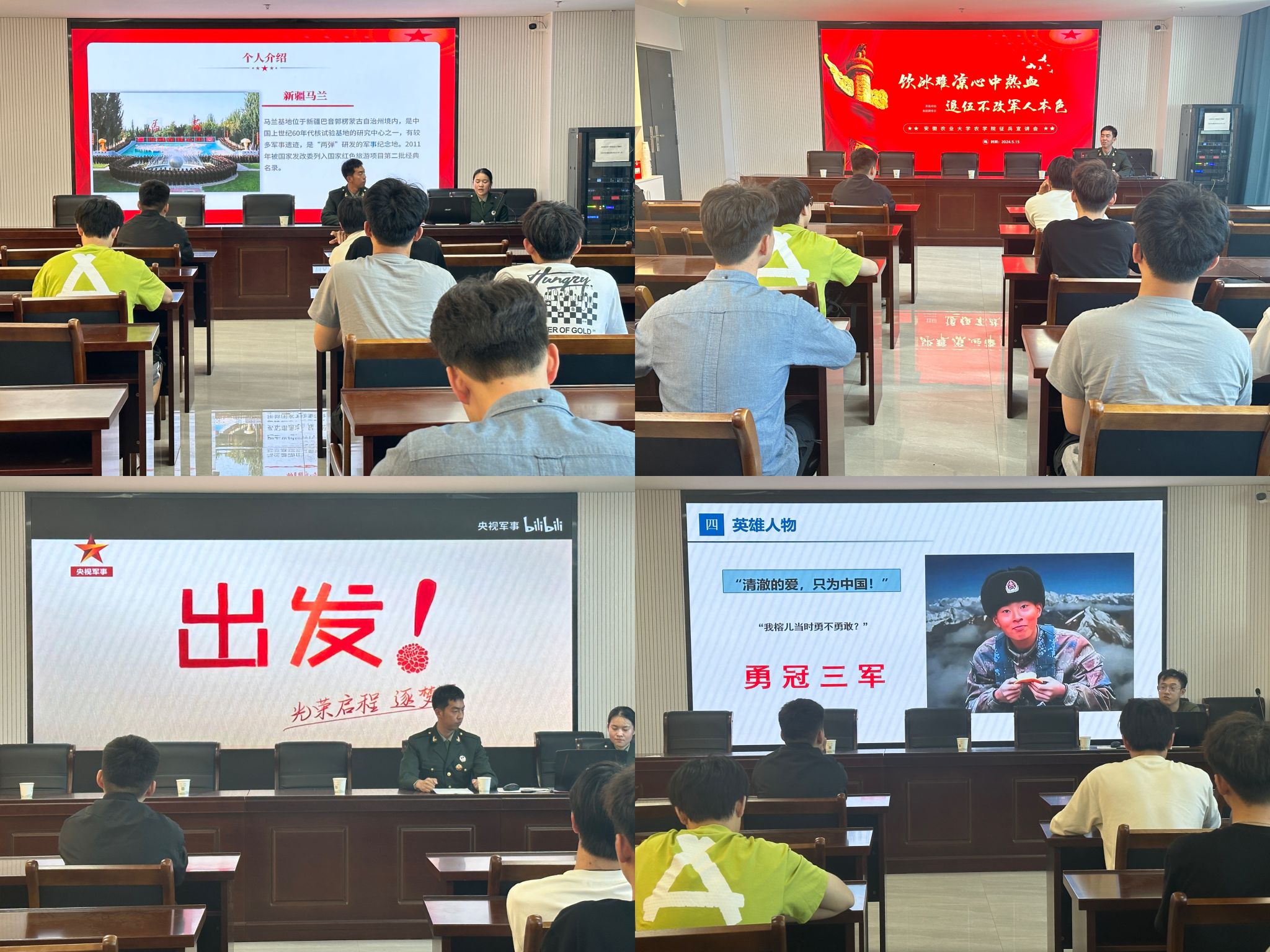 会议伊始,农学院周毅老师介绍了本学院春季大学生征兵入伍情况并作动员报告。他在会议中倡议大学生要积极响应国家号召,心怀爱国情,保家卫国。随后,由退伍大学生士兵孙丽雯讲述了自己的军队生活,她服役于新疆马兰基地,主要负责报物机房执勤、无线电通讯保障、短波及超短波通讯联络等工作。她在发言中说道:“在部队的生活是有规律有秩序的,不是想象中的那么热血沸腾,但是驻扎新疆马兰的生活仍让我感到丰富、美好。”两年的入伍经历,不仅锤炼了她的意志,更加深了对祖国的拥护与热爱。紧接着由退伍大学生士兵夏继对今年的征兵政策进行解读和介绍,主要针对报名时间及方式流程、应征对象与条件、优惠政策、报名注意事项四个部分展开介绍。同时,他以生动有趣的方式讲述了自己的军旅时光与成长变化,以电影《我和我的父辈》里的内容“渺小的尘埃,是宇宙的开始;平凡的渺小,是伟大的开始”作为结尾,鼓励大学生强化意识,用矢志不渝铸培爱国之情。最后经济管理学院侯建军老师作了题为“清澈的爱,只为中国”的国防教育报告,他提出参军入伍是大学生成长成才、提升思想境界、锻炼意志品质、提升综合能力的重要途径。身处和平年代,心中不能没有狼烟,大学生要砥砺争先,用发奋图强铸造强国之志。