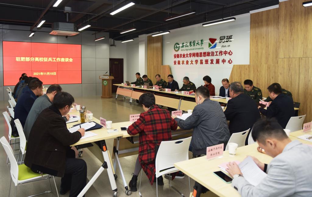 本网讯 11月15日,驻肥部分高校征兵工作座谈会在我校易班发展中心召开。省征兵办公室、省教育厅、合肥市、蜀山区征兵办公室等有关负责同志,以及部分高校分管校领导、征兵工作站负责人参加会议。校党委副书记裴树东出席会议并致辞。会议由学工部(处)、武装部部长姚莉主持。