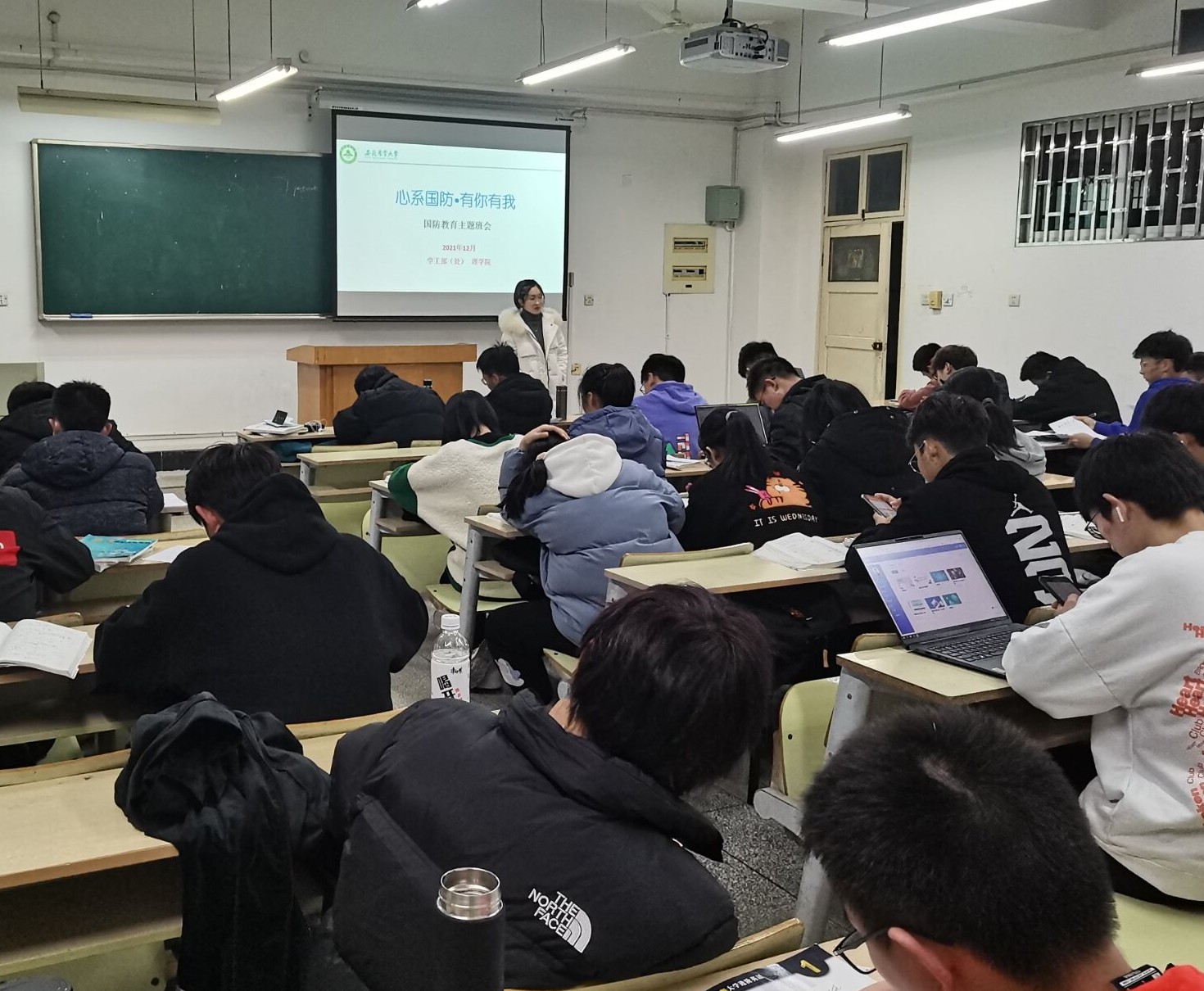 会上,辅导员从国防的涵义、国防现状、现代化国防建设与国防发展历程等多个方面为学生进行了讲解。同时穿插着鲜活的事例、多彩生动的视频等,让同学们回顾了人民军队建设发展历程的诸多艰辛与不易,也了解了我国国防科技力量和国防现状。在班会上,不少同学发表了自己对国家发展、国防建设和征兵入伍的认识和看法。最后各班还进行了总结,并鼓励同学们珍惜我国国防带来的和平安定生活,积极进取,为祖国的国防建设贡献自己一份力量。