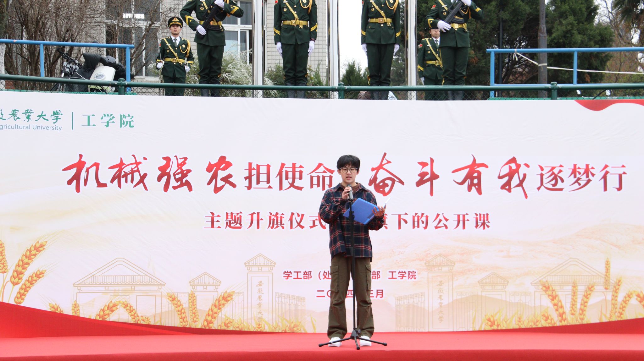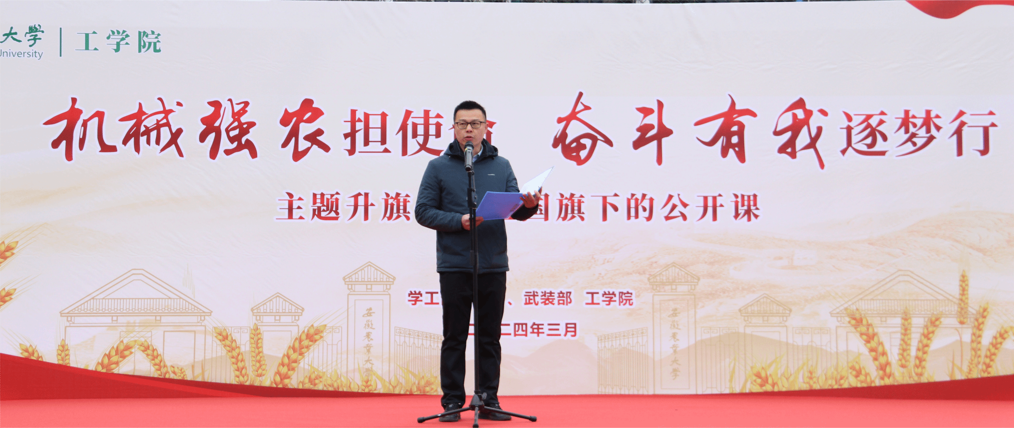 本网讯 3月18日早晨,工学院在校第一运动场举行“机械强农担使命 奋斗有我逐梦行”主题升旗仪式暨国旗下的公开课。校学工部(处)、武装部副部长卢伟参加活动。学院党政领导、全体专兼职辅导员和2023级全体同学参加了此次活动,学院党委副书记张璐主持活动。