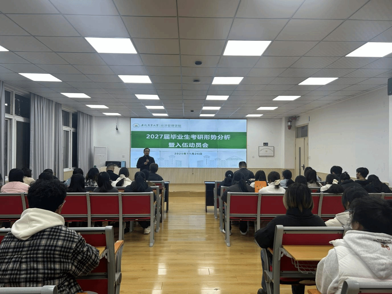 本网讯 为帮助2027届毕业生明晰考研趋势、把握入伍政策,11月26日晚,经济管理学院在经管楼103教室召开2027届毕业生考研形势分析暨入伍动员会。会议由学院党委副书记、纪委书记周涛主持,2027届考研学生、学院邀请的两家考研研究机构负责人及学院征兵负责老师参加了会议。