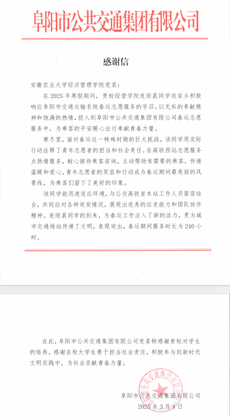 本网讯 近日,安徽农业大学经济管理学院党委收到了一封来自阜阳市公共交通集团有限公司的感谢信。信中对学院本科生连雨晨同学在2025年寒假期间积极参与春运志愿服务的突出表现给予了高度评价和诚挚感谢。这封感谢信不仅是对连雨晨同学个人奉献精神的肯定,更是对学院育人成果和社会责任感的充分认可。