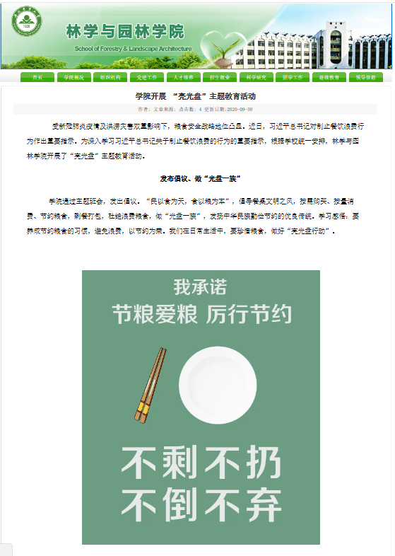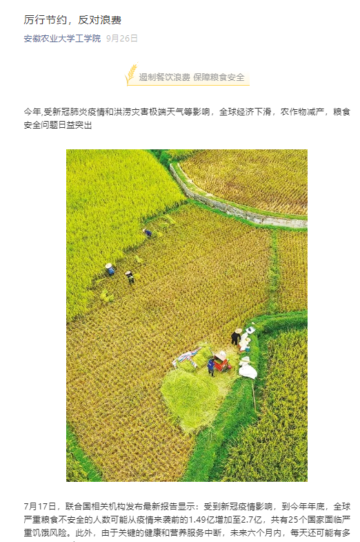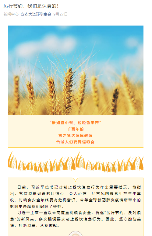 今年,受新冠肺炎疫情和洪涝灾害极端天气等影响,全球经济下滑,农作物减产,粮食安全问题日益突出。习近平总书记对制止餐饮浪费行为作出重要指示“要进一步加强宣传教育,切实培养节约习惯,在全社会营造浪费可耻、节约为荣的氛围。”学工部(处)根据校党委统一部署和要求,号召广大青年学子积极投身“节粮爱粮,厉行节约”行动。