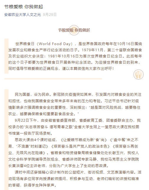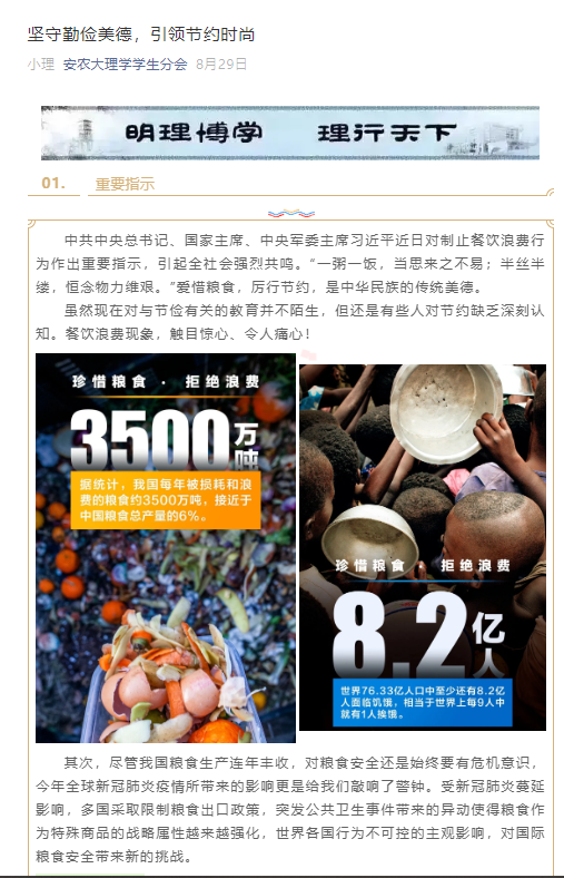编者按:10月16日是世界粮食日,为贯彻习近平总书记对制止餐饮浪费行为作出重要指示精神,校学工系统于8月下旬组织开展了“遏制餐饮浪费 保障粮食安全”专题学习实践活动。为迎接今年这个非同寻常的粮食日,本文就活动开展以来,对广大青年学生“认真学习领会总书记的谆谆教诲,即刻行动起来、从我做起、从现在做起”的鲜活案例进行宣传,敬请关注,并希望全体大学生争做崇尚节俭、尊重劳动、爱粮惜粮的新时代安农人。